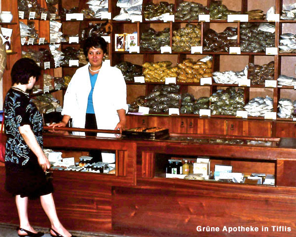 Für die Nutzung als Heilmittel gibt es in Georgien viele alte Kloster- und Familienrezepte. Und es gibt sogar „Grüne Apotheken“, in denen man sowohl Kräuter und Gewürze kaufen kann, als auch Spezialitäten, die aus ihnen hergestellt werden und die der Gesunderhaltung dienen.